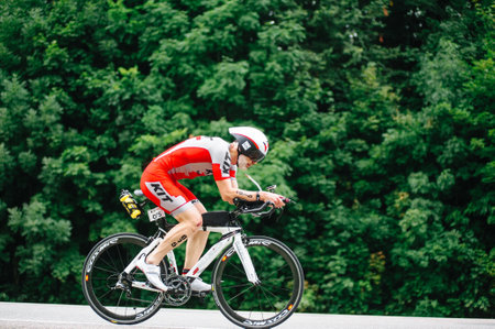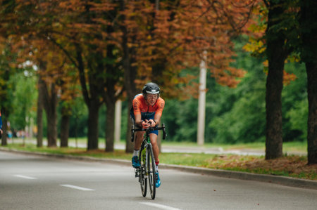 KHARKIV, UKRAINE - August 2, 2020: Triathon biking cyclist triathlete riding racing bike during ironman competition. Road cycling athlete in tri suit and helmet. Public events are allowed. Europe sport during CV pandemic.
