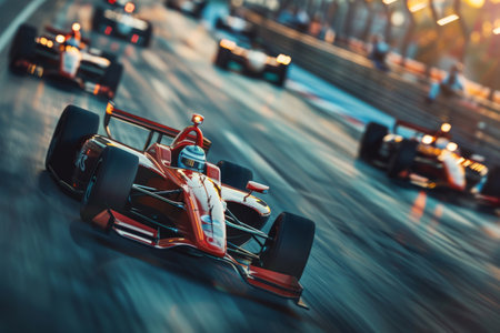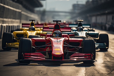 A stunning image capturing the thrilling dynamics of F race cars, featuring sleek designs, powerful engines, and expert driving skills during a high-stakes racing event under vibrant conditions.