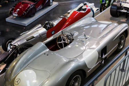 STUTTGART, GERMANY - OCTOBER 16, 2018: Mercedes Museum. One seat sport car parked on the stand with light from below.