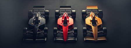 Red, blue, and yellow race car huddle together at starting line. Modern, colorful race cars lined up on starting grid.