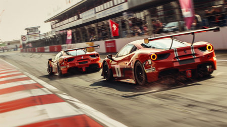Two vibrant red sports cars speeding along a race track, showcasing their power and speed, The tension and adrenaline in a sport car racing stadium moments before the start of the race, AI Generated