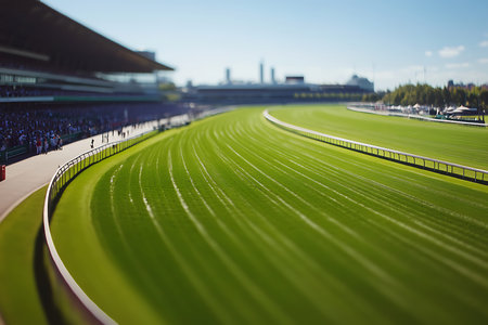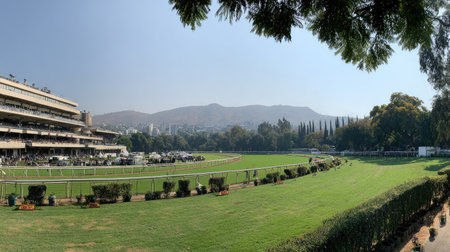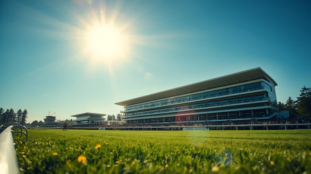 A stunning view of a horse racing track featuring lush green grass and grandstand buildings. The scene captures a peaceful atmosphere under a soft sky, perfect for events.