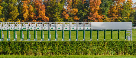 Wroclaw, horse racing track, starting gates for horses, autumn landscape with colorful trees on a sunny day.