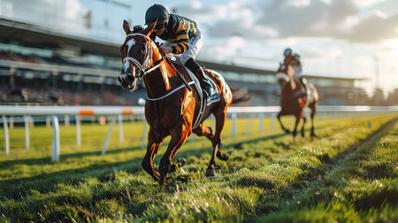Horse race with jockeys on the racecourse at sunset