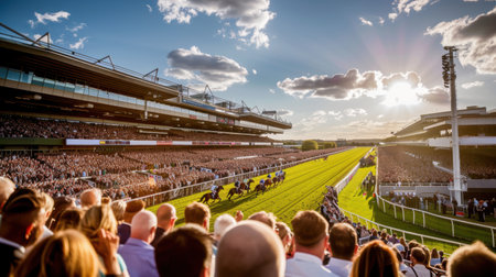 Large crowd watching horse race at Derby event on sunny day. Grandstands are packed with spectators, horses and jockeys race down green track