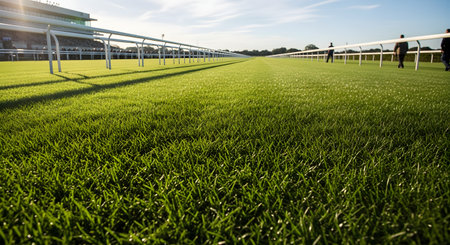 A pristine, vibrant green grass turf of an empty horse racetrack stretches into the distance on a sunny day. The low angle and white railings create a sense of scale and anticipation, perfect as a background for equestrian and sporting themes.