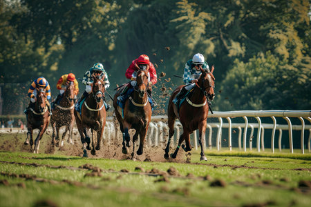 Four determined jockeys in colorful silks race toward finish line, competing for the victory with fierce energy on racetrack with green field aside. Kentucky Derby event, horse race, sportFour determined jockeys in colorful silks race toward finish line with fierce energy on racetrack with green field aside. Kentucky Derby event, horse race, sport