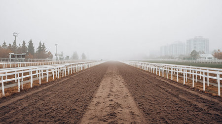 Horse racecourse in the foggy morning. Russia, Sochi