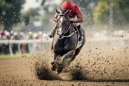 A powerful thoroughbred racehorse and its determined jockey thunder down the dirt track, kicking up dust in their wake. Captured in a moment of peak athletic performance, this image embodies the speed, adrenaline, and intense focus required to win the race.
