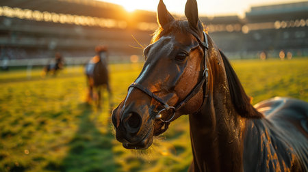 Close-up of a horse in a racecourse. Horse portrait