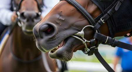 A detailed close-up shot focuses on the mouth and muzzle of a brown horse wearing a leather bridle and a metal bit. The image highlights the texture of the horse's skin, its whiskers, and the details of the equestrian tack, conveying a sense of equestrian sport and animal handling.