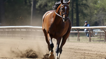 Dynamic Racehorse Galloping on Dirt Track with Jockey Focused on Winning