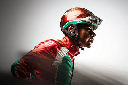 A professional racer wearing a helmet looks intensely focused before the race, embodying determination and readiness for the competition.