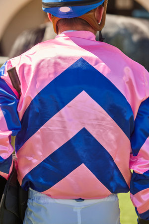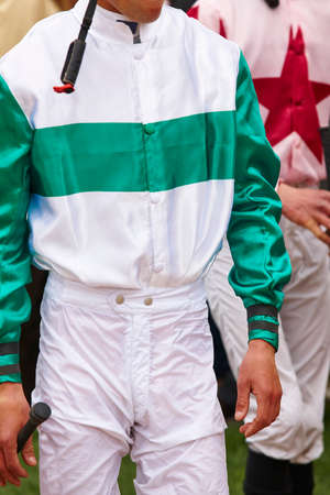 Jockey detail before the race. Hippodrome background. Racehorse. Competition