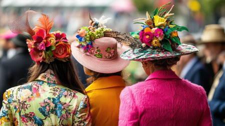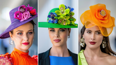This image showcases three elegant women wearing colorful hats adorned with flowers, embodying style and sophistication for festive events.