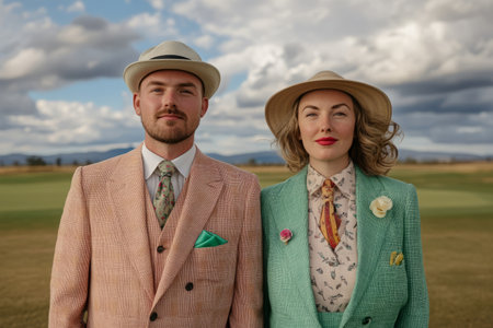 Stylish couple wearing formal hats in elegant outfits. Classic look