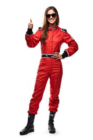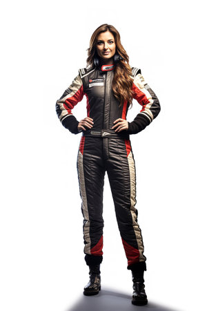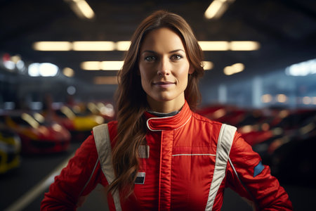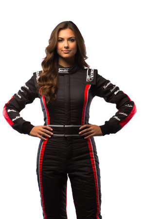Portrait of a race car driver in full gear at the illuminated circuit, focus on safety and speed