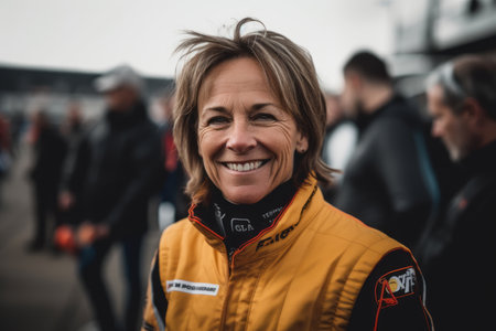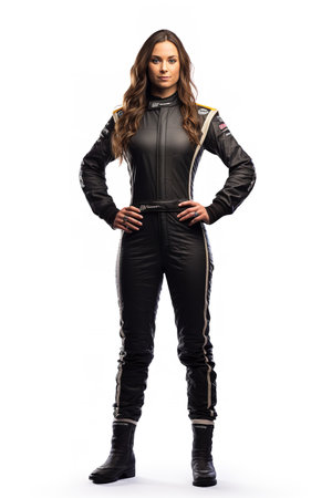 A focused female race car driver wearing a helmet and racing suit stands in the pits, ready to compete at a motorsport event.