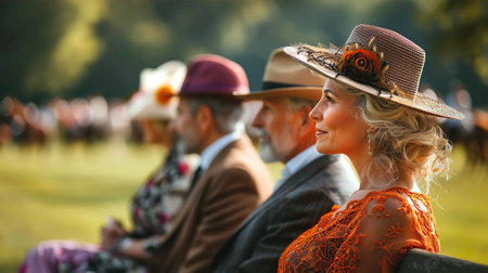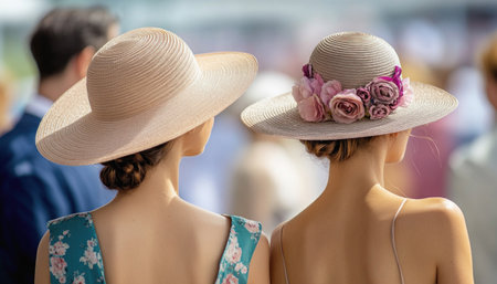 Two elegant women with summer hats are enjoying a sunny outdoors social event