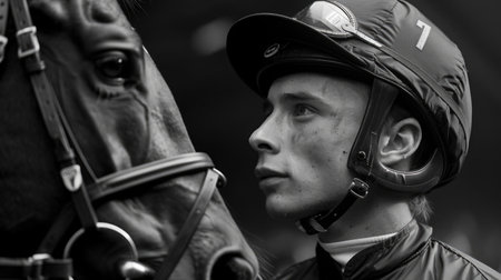 A heartfelt moment between a jockey and their horse in the paddock before the race, with the jockey whispering words of encouragement into the horse's ear