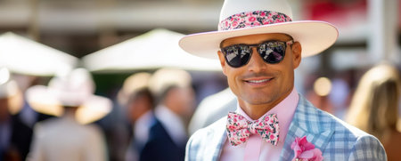 Stylish man dressed for festive Kentucky Derby event, in light blue plaid suit jacket over pink shirt, accented with wide-brimmed white hat.