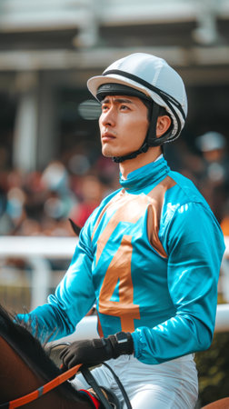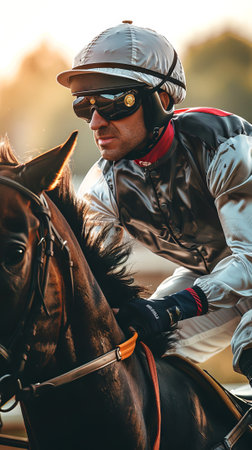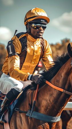 A close-up of a jockey in race gear, riding his horse with determination, showing focus and strength, ideal for horse racing advertisements