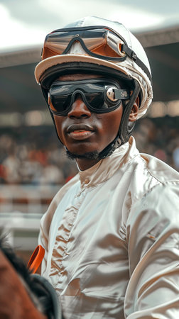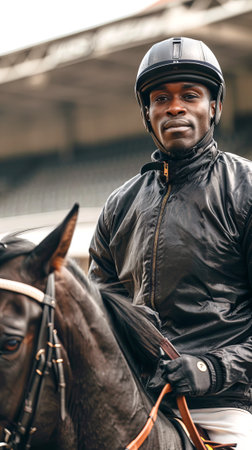 African American male jockey in racing attire with helmet at a horse race. Concept of horse racing, equestrian sport, athlete, competitive riding.
