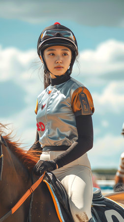 Asian female horse rider in a helmet on a racehorse during a competition. Concept of equestrian sport, horse racing, competitive riding, athlete woman, female jockey. Vertical.