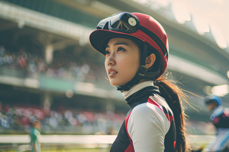 Asian female jockey in colorful riding attire and helmet. Concept of horse racing, female athlete, equestrian sports, professional jockey.