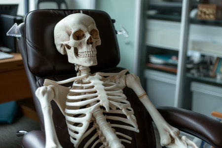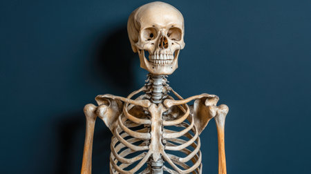 In this educational setting, a model of a human skeleton is showcased for study and learning purposes. The skeleton is anatomically correct and detailed, illustrating the structure and function of the human skeletal system.