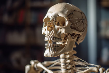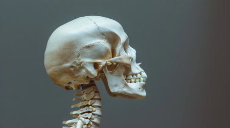 Side view of human skeleton model with dim lighting, anatomical study concept