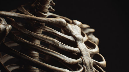 The focus is on the rib cage of a human skeleton highlighting the intricate details of the rib bones and the associated muscles