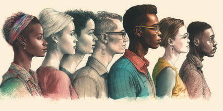 Row of diverse men and women facing sideways with multicolored gradient symbolizing inclusion and equity. Representation of multiracial group.
