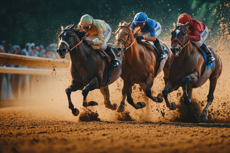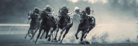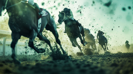 A captivating scene of a horse race showcases the intense competition between jockeys on fast-moving horses, highlighting the thrill and energy of the sport.