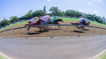 Horse racing horses jockeys motion speed blurs running action close-up track inside railing on sand poly section perspective on a clear blue day.