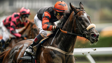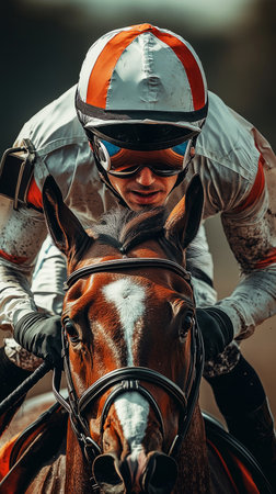 A close-up of a jockey in race gear, riding his horse with determination, showing focus and strength, ideal for horse racing advertisements