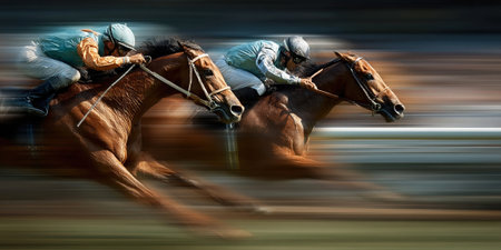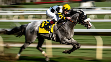 Dynamic image captures intense motion of horse racing event. Racehorse galloping at full speed with jockey urging horse onward. Blurred background