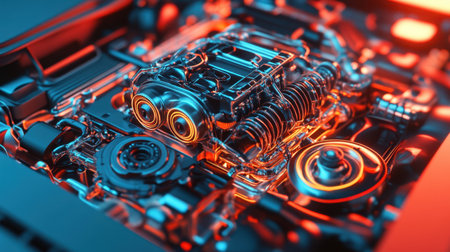 Close up of a futuristic engine glowing with red neon lights, showcasing advanced technology and power