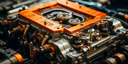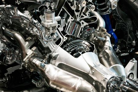 Detailed close up of innovative car engine prototype in high definition cutaway view
