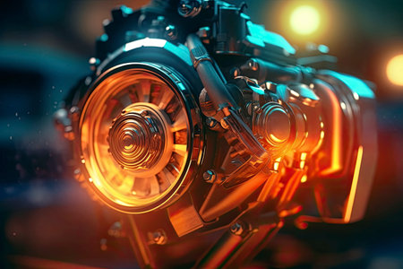 Tthis image showcasing the glowing heart of a precision-engineered motor. The intricate play of light and shadow captures the essence of modern mechanical brilliance