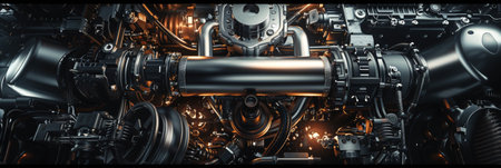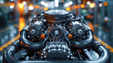 A detailed macro shot highlighting a gleaming engine's complex components, with woven hoses and precision-crafted metalwork reflecting cutting-edge engineering mastery.