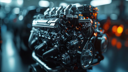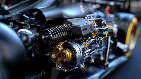 A stunning close-up image showcasing a modern engine with sleek metallic components, showcasing intricate details that highlight automotive innovation and performance.