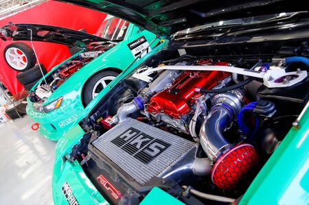 SINGAPORE - APRIL 24: Engine bays of drift cars at Singapore Formula Drift at F1 Pit Building April 24, 2010 in Singapore