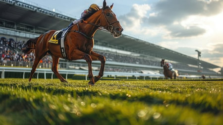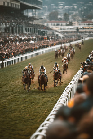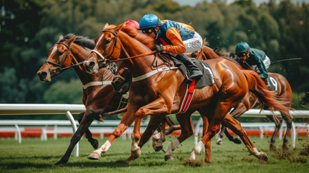A captivating scene of a horse race showcases the intense competition between jockeys on fast-moving horses, highlighting the thrill and energy of the sport.