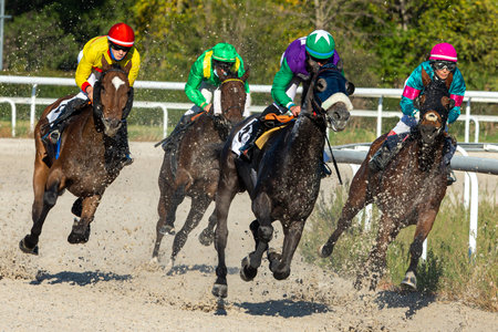 Racehorses ridden by jockeys running fast during the race at race course from start to finish. Striving to victory. Horizontal image, motion blur.