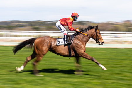 Madrid, Spain- March 21, 2021: Photo with speed effect of a racehorse at the La Zarzuela racecourse in Madrid. Horse races. Horse racing. Jokey on racehorse