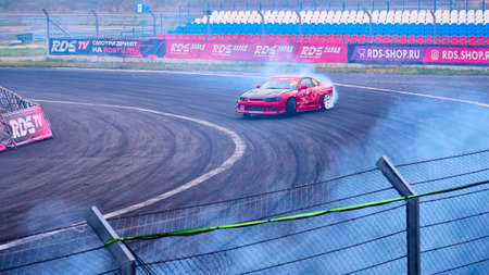 Russia Ryazan International Track Atron September 2020. A sports car in a controlled skid on the track. Smoke billows from under the wheels