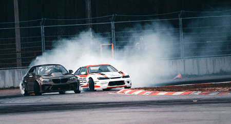 Blurred racing drift car with lots of smoke from burnt rubber wheels. Competition