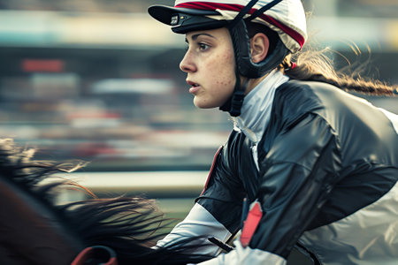 Caucasian female jockey riding a horse during a race. Concept of horse racing, woman athlete, equestrian sports, competition.
