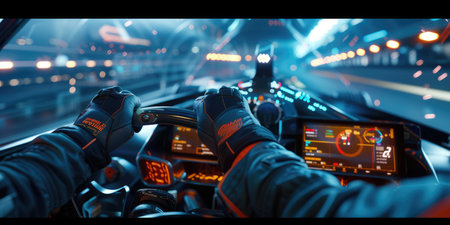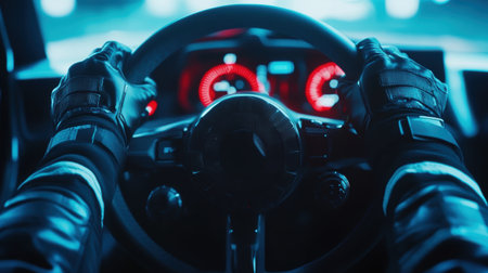 Perspective from inside the car. Racer hands wearing black gloves gripping steering wheel of car, with blue and red dashboard illuminated in the background.